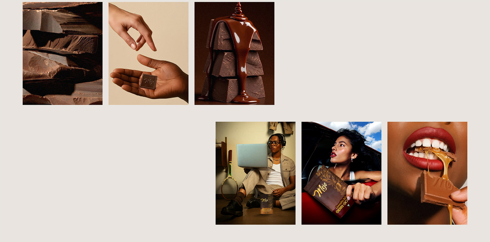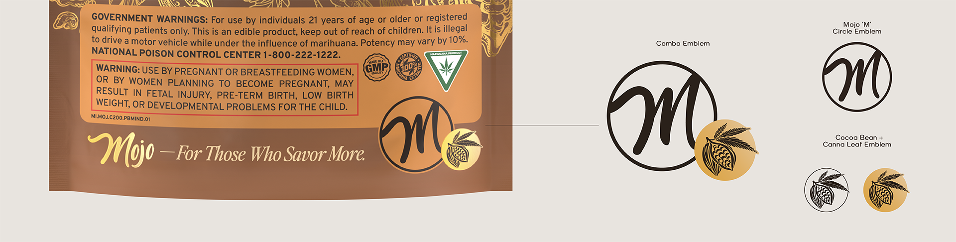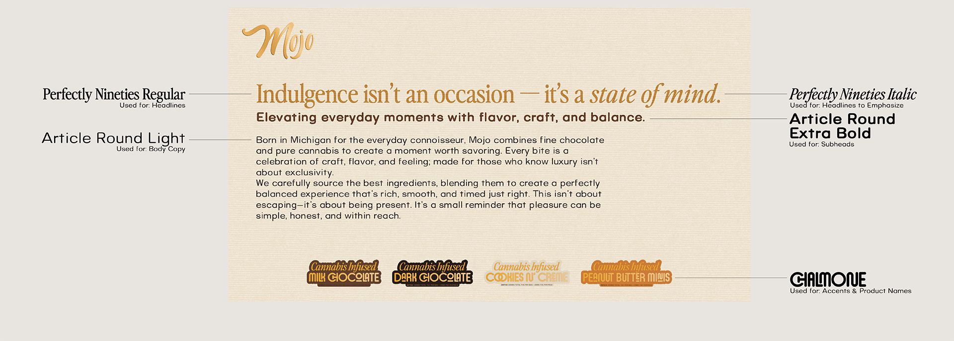 Mojo is a Michigan-based cannabis confections brand that wants indulgence to feel intentional and accessible. When I started working with Mojo, they needed a full overhaul. The existing look felt generic and disjointed: it was poorly designed, lacked personality, and had no real system or guide behind it. Their logo had some recognition in the market, but everything around it was inconsistent and emotionally flat. The challenge was twofold: raise Mojo into an accessible premium space while still feeling friendly and easy to approach, and convince those in charge that they had an opportunity to transform this brand into more than just the cheapest chocolate cannabis brand on the shelf.