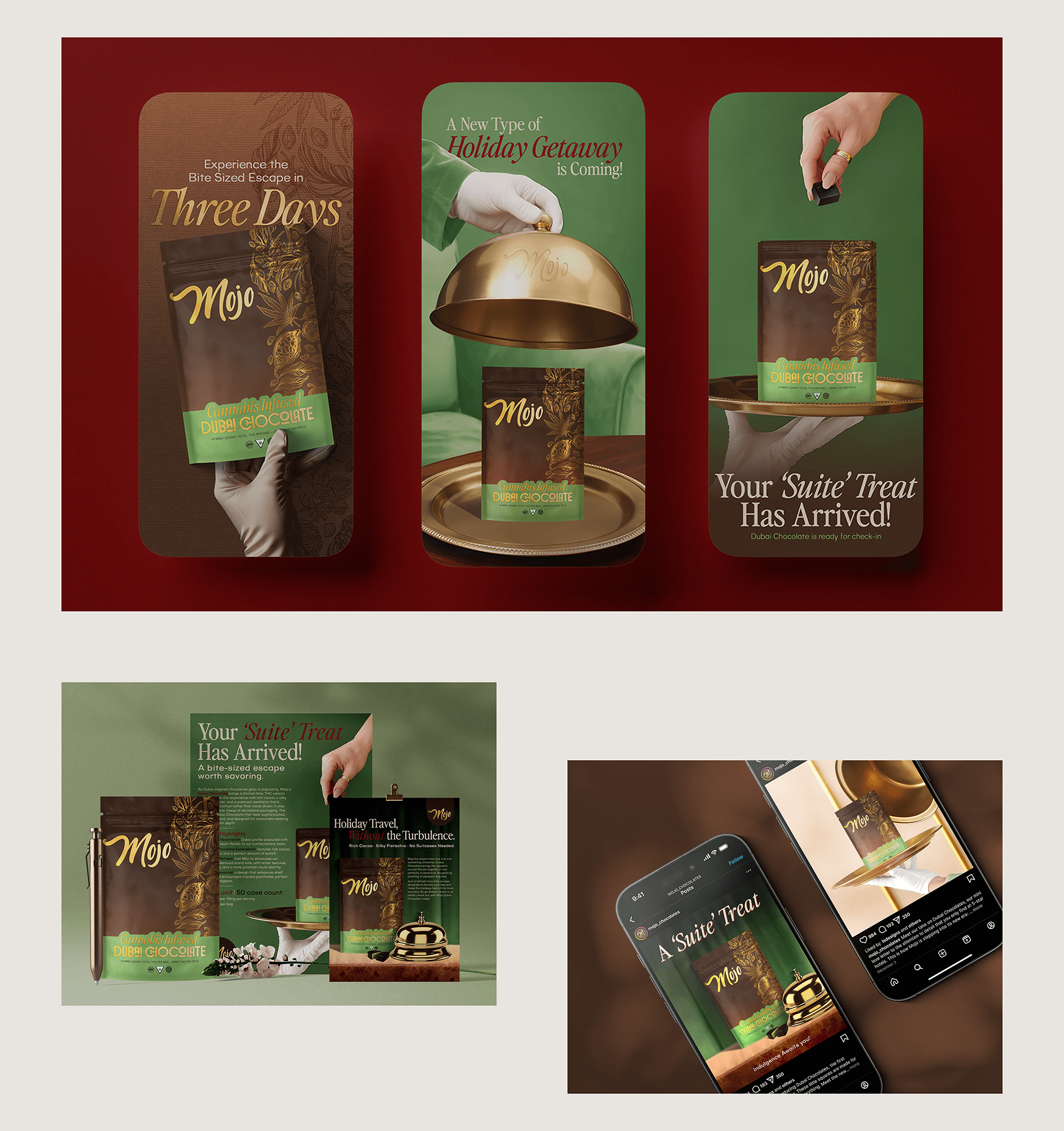 As the first expression of the new Mojo identity, I led a limited holiday launch for Cannabis Infused Dubai Chocolate that framed the product as a luxury escape from holiday stress. We used hotel‑inspired headlines and imagery across email, social, in‑store screens, menus, sell sheets, and web banners to turn a single limited‑time SKU into a mini “holiday getaway” and the official reveal of the refreshed brand. Working with no production budget, I utilized AI to help create the visuals, which let us push the campaign further visually while still feeling cohesive with the new system.